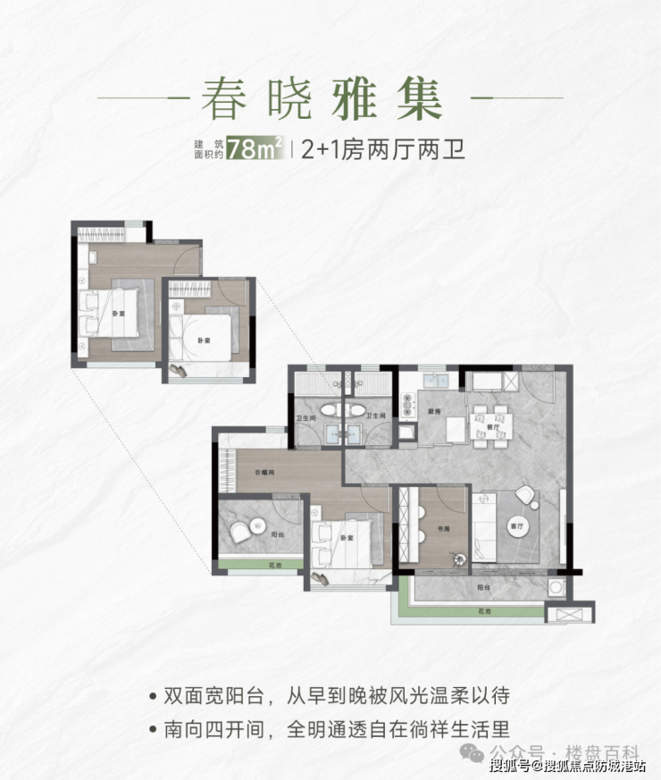 核心价值: 功能全面的紧凑型四口之家首选。实现双卫配置,主卧套房设计,带独立飘窗。该户型拥有最大的设计灵活性,可根据家庭结构变化,将一间卧室改造为书房或儿童活动区。部分楼栋的89㎡户型享有中心园林或远眺火炉山景观。