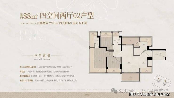 88㎡四房两卫:项目王牌户型,白鹅潭惟此新规四房,88㎡实现四房设计,空间利用率极致化;主卧套房设计,搭配双阳台,兼顾居住舒适度与实用性,完美适配二胎家庭或三代同堂。