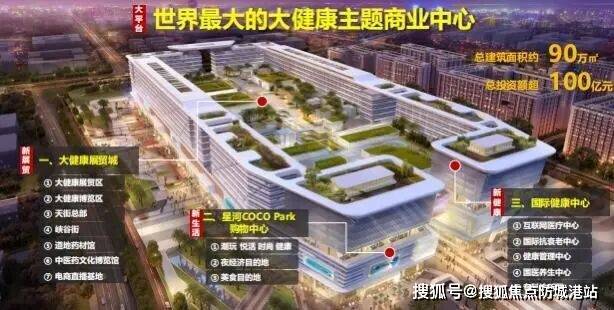 项目涵盖多种产业,临街商业、购物中心、展览中心、商服产品、住宅、写字楼和酒店等;共分四期开发,一期是健康方舟,二期是打造高端一线临江住宅,三期是大健康产业服务配套区(涵盖商服产品、写字楼、新型产业孵化园),四期是国际大健康产业港湾总部集聚区,项目规划有300米高的七星级健康主题酒店,200米高的超甲级写字楼。