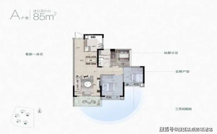 85㎡三房是刚需上车选择,三开间朝南,客厅带阳台,采光充足,紧凑的布局让每个空间都不浪费,总价80万左右就能拿下;