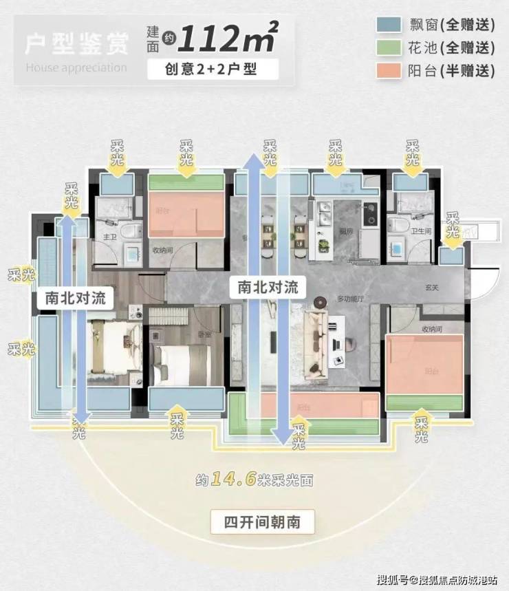 112㎡户型:高性价比大四房设计,客厅宽达5.2米,配有三个阳台,享有270°观景飘窗。