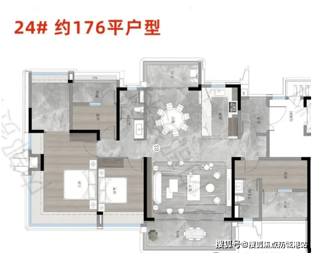 176㎡户型:配备独立私家电梯厅,入户玄关转角设计保障隐私;LDKB一体化大方厅,社交属性拉满;南北双阳台,功能分区明确;最多可形成3个套房,满足多代同堂或二胎家庭需求;多功能房灵活可变,随家庭成长自由调整。