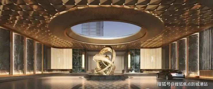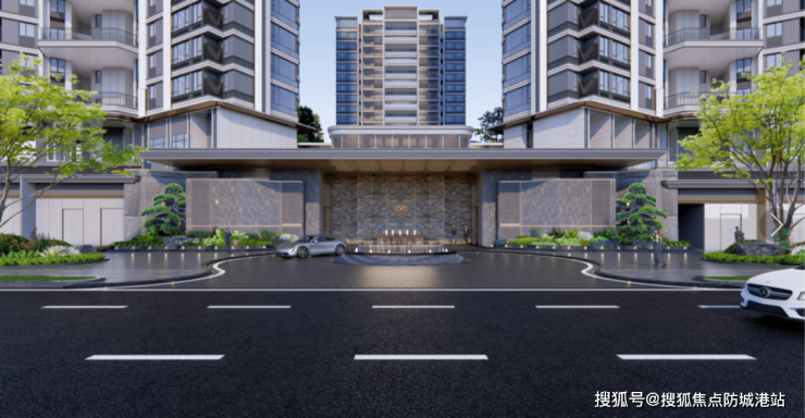 项目把主入口设计成了酒店式环岛,门楼高达7.7米,还规划了下沉式庭院。