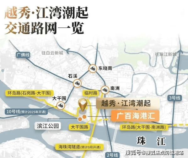 交通方面,项目距地铁10号线大干围站直线约650米,该线路贯穿天河、越秀、海珠、荔湾四大核心区,直达珠江新城、体育西、五羊邨等核心商圈。同时,海珠湾隧道已开通,15分钟快速通达广州南站;环岛路(石岗路-大干围段)临时道路年内贯通,区域通行效率显著提升。