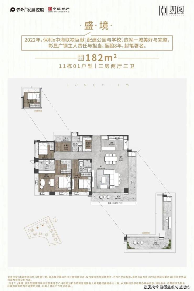 中海保利朗阅位于广州市荔湾区广钢新城南区,占地面积约5.09万平方米,建筑面积约为22万平方米。该项目由保利发展与中海地产两大央企联手开发,提供从约98㎡至182㎡的三至四房平层住宅。小区绿化率为35%,容积率为4.33,层高为31层,梯户比分别为1栋/11栋3梯3户,2-7#栋2梯5户,8-10栋2梯6户。