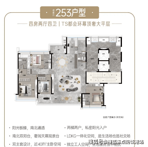 建面约 253㎡定奢五房:限量级 CBD 低密板式高层,约 10.3 米宽巨幕阳台,双主卧套房,总统级主卧配备双洗手台与浴缸,适合顶豪家庭居住。