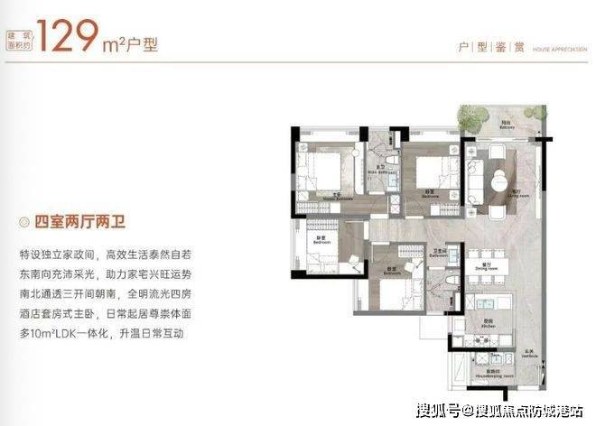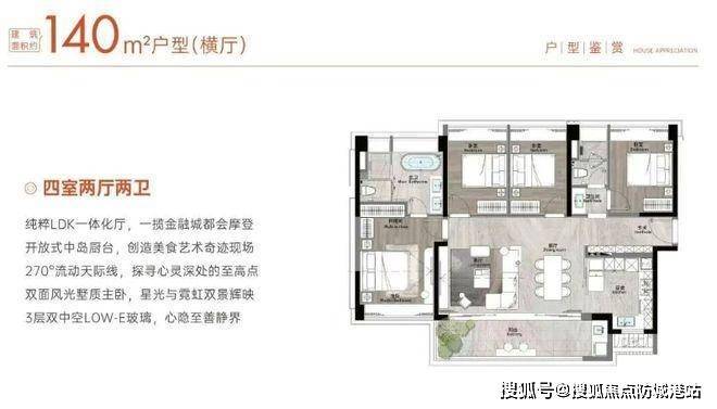 走进户型设计,129㎡四房做到了南北通透,主卧套房带独立卫浴,次卧尺度也比较方正,厨房和餐厅连通客厅,形成比较开阔的动区。140㎡版本分横厅和竖厅两种,横厅更适合喜欢大面宽的家庭,采光和通风表现更好;竖厅则客厅进深更大,适合摆放沙发电视组合,家庭聚会时更有氛围。180㎡户型属于改善型选择,双套房设计,空间更从容,主卧带衣帽间和双卫,整体奢适感明显提升。层高统一3米,实际居住层高会略有压缩,但视野和通透感依然不错。