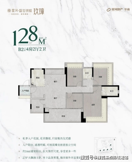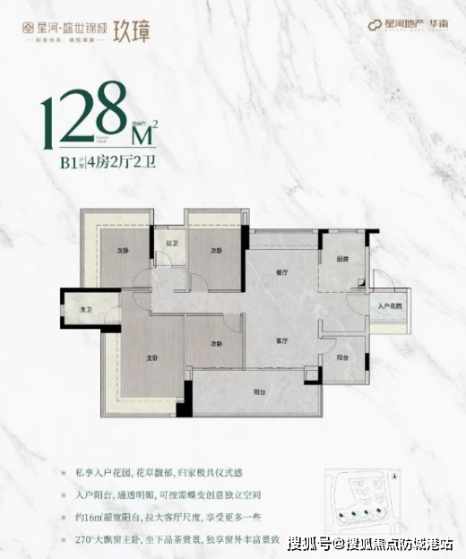 128㎡户型:独立入户花园设计,厨房、客餐厅和主卧尺度大幅提升,带来宽敞明亮的居住环境。
