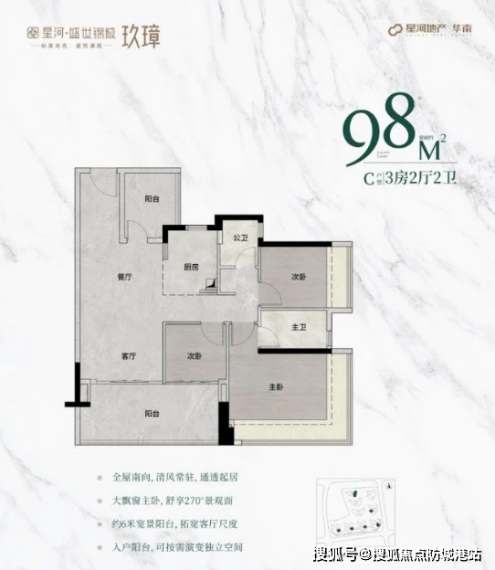 98㎡户型:主朝向朝南,主卧配备270°无柱飘窗,次卧和阳台尺度大幅增加。