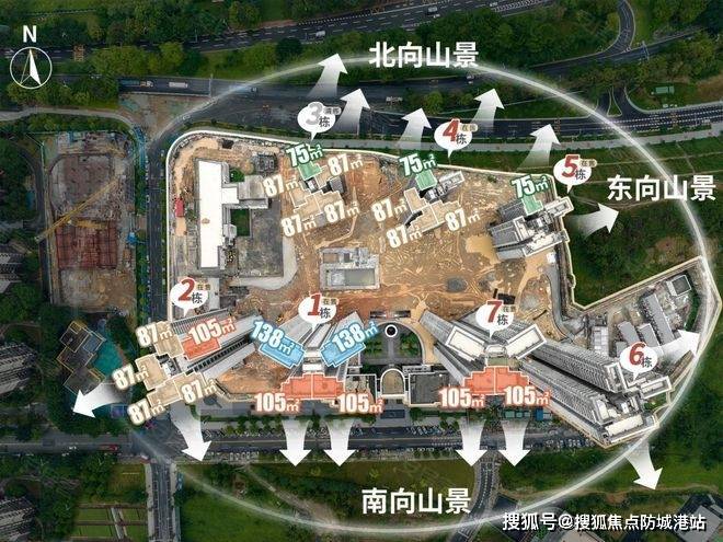 户型设计亮点十足。整个项目 7 栋商品住宅,前排 4 栋 32 - 33 层,后排 3 栋 16 - 17 层,3 - 4 - 5 - 6 栋为 2 梯 5 户,1 - 7 两栋为楼王,2 梯 4 户。前后两排布局优势明显,散点式排布提高单边位采光和视距,增加单边位货量;前后平行排布形成通透式中心园林,拉大楼栋间距。