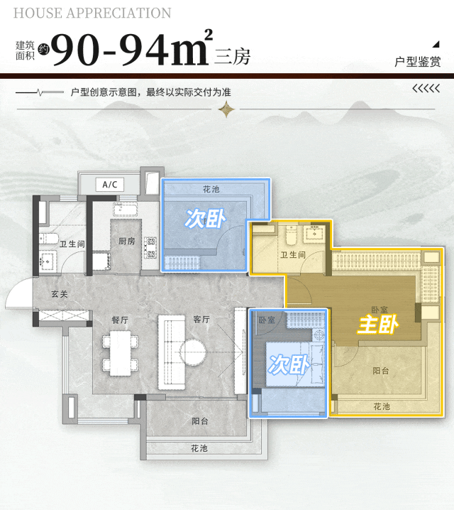 首先来看约90-94平方米的三房户型。该户型提供横厅和竖厅两种选择,满足了不同客户的喜好。横厅设计的客厅拥有接近6米的超大面宽,搭配270度全景飘窗,不仅增加了室内的采光面积,还赋予了更多的收纳空间。主卧面积最高可达24平方米,即便是在新规后的产品中,这样的空间配置也堪称奢侈。而对于那些追求南北通透的客户,还可以通过调整餐厅和次卧的位置来实现更加理想的布局。