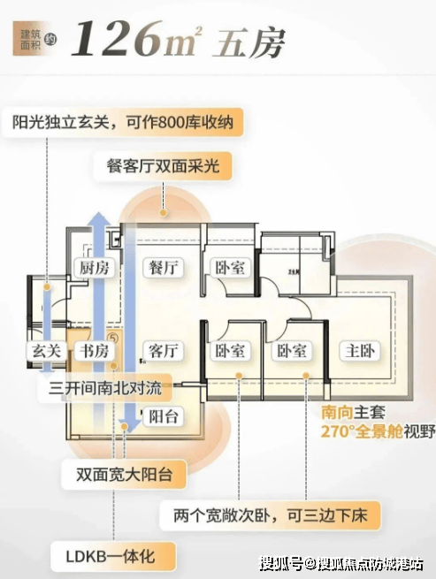 建面约126㎡:5.5开间朝南,四间卧室均朝南,南北对流,双面宽大阳台,客餐厅尺度宽敞,居住体验极佳。