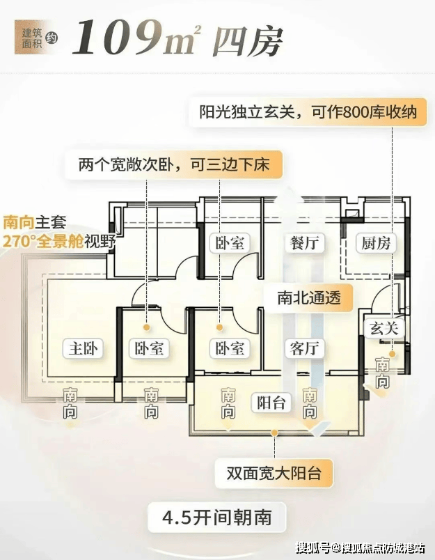 建面约109㎡:南北对流设计,四房朝南,双面宽大阳台,客餐厅尺度阔绰,玄关处设有800库空间,增强收纳能力。