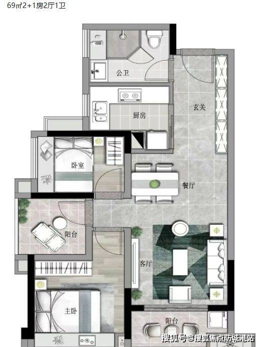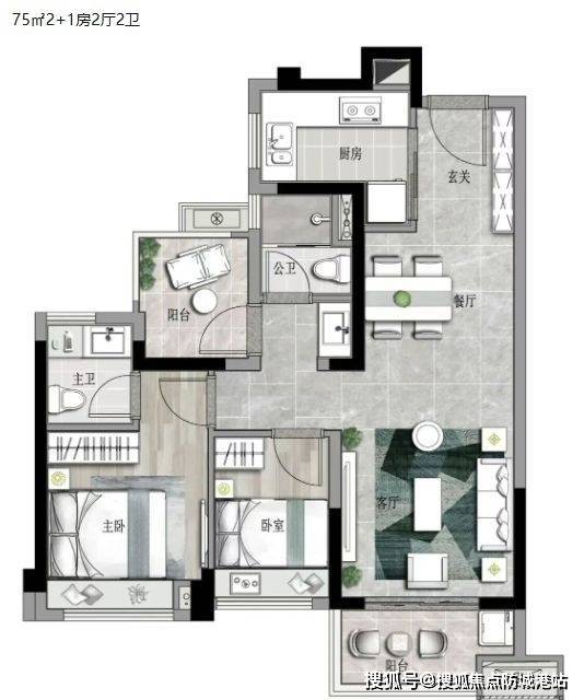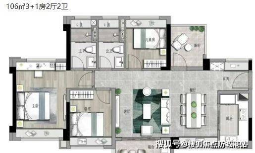 在户型设计方面,本项目主推产品为六十九平方米、七十五平方米、八十二平方米、八十九平方米及一百零六平方米区间的二至三房产品,户型普遍具备“N+1”功能空间,即在固定房间外设置可拓展空间,用于儿童房、书房或储物区,使同等面积获得更高功能承载能力。
