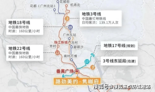 路劲美的隽樾府位于番禺区府板块,紧邻番禺广场,周边有多个政府单位和商业设施,生活便利度极高。此外,这里还有多条地铁线路交汇,包括3号线、18号线、22号线以及规划中的17号线,极大提升了通勤效率。
