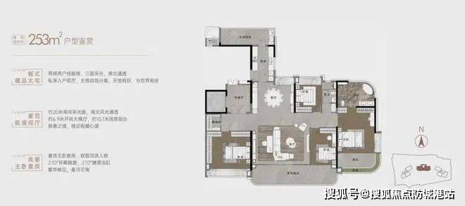 楼王单位:253平米的户型作为楼王,采用了2T2专梯专户设计,南北通透,低密板楼的设计不仅保证了室内的通风采光,更彰显出豪宅的高贵品质。