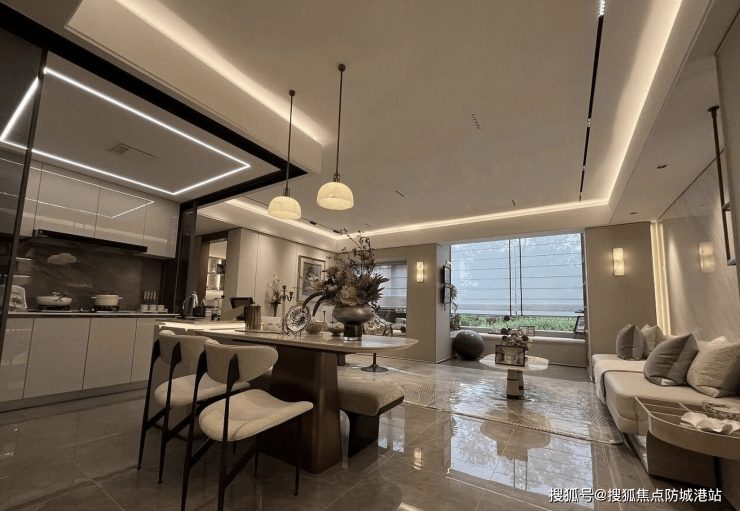 步入雍云邸的实体样板间,首先感受到的是新规户型带来的空间革命。以105㎡的四房样板间为例,其LDKB(客、餐、厨、阳台)一体化设计打破了传统的功能隔阂,形成了一个近40平方米的家庭核心社交场域,空间感媲美市面上120㎡的传统户型。
