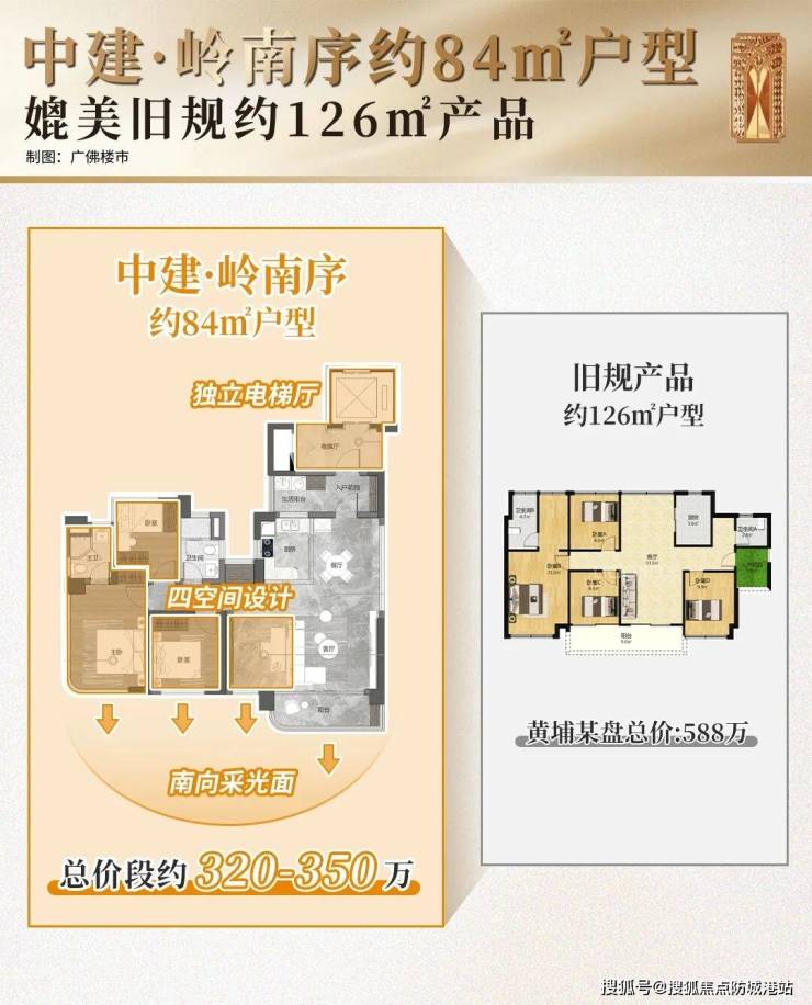 84㎡户型:南向布局,四房+独立电梯厅,实际使用面积达126㎡,单价约2.6万/㎡。