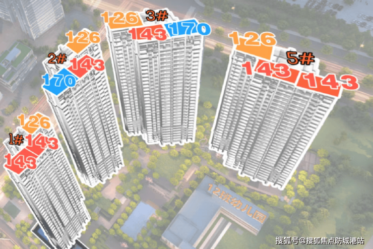 项目目前在售4栋高层住宅,其中1#高40层,2-3#高44层,5#高41层,均采用2梯3户配置,保障上下楼便捷性,减少等待时间。户型涵盖建面约126㎡三房、143㎡四房、170㎡四房三种,适配不同改善型家庭需求,整体采用尊梯入户设计,提升居住私密性与尊贵感。