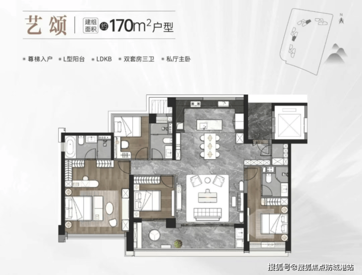 建面约170㎡四房:在上述户型优势基础上,升级双套房三卫设计,主卧配备私厅与独立卫浴,最大化保障主人私密性与尊贵感;多飘窗设计,进一步拓展观景视野与使用空间,公共区域开阔通透,既能满足家庭日常居住,也可应对亲友聚会等场景,是高端改善的首选户型。
