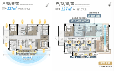 128㎡四房:南北通透双阳台,主卧套房带独立衣帽间,部分户型赠送30-60㎡私家花园/星空露台,实用率超135%;