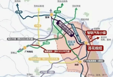 智联汽车小镇所在的莲花湾板块,是广州城市南向发展的重要节点,紧邻琶洲(直线距离 24 公里),可承接琶洲电商总部、大学城科创产业的外溢人口和资源。随着南大干线全线贯通,板块与万博、南站、琶洲等核心板块的联动愈发紧密,交通路网的完善将进一步带动区域发展。