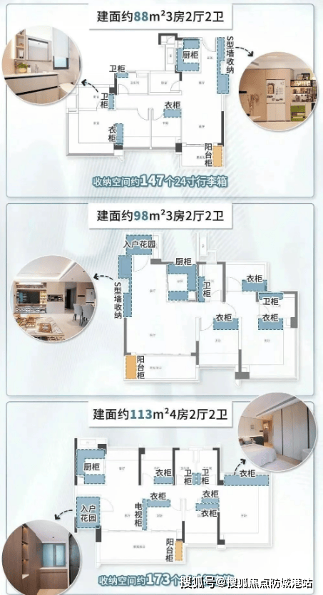 首期推出两栋住宅,1号楼47层、2号楼31层,均为南向布局。主力户型为88㎡三房、98㎡三房和113㎡四房,全部采用新规设计:比如88㎡户型做到全屋飘窗可利用,玄关设置双面柜体,厨房预留冰箱位并优化动线;113㎡四房主卧带L型转角飘窗,次卧与书房可灵活打通。实用率普遍在85%以上,没有明显浪费空间。