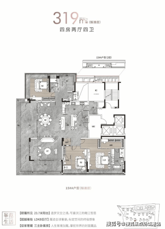 214–319㎡大平层:作为白云首个珠江大平层产品,以5.7米宽厅、17–24米超长观江面震撼市场,四开间朝南,超高使用率,堪比市中心千万级豪宅尺度。