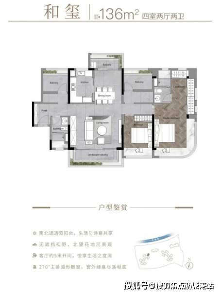 136㎡四房两卫:唯一的双阳台户型,进一步提升了居住品质。