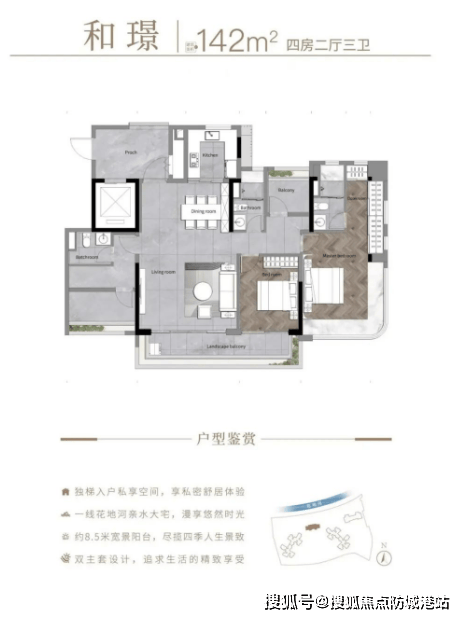 142㎡四房两卫:享有绝佳的一线花地河景观,是中轴王座的理想选择。