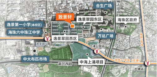 答:致景轩位于海珠区广州大道南板块,毗邻海珠区政府,距离地铁 11 号线逸景路站约 500 米,周边交通便利,配套成熟。