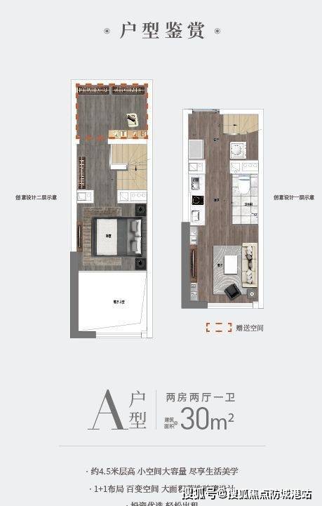 虽面积精巧,但布局合理,充分利用每一寸空间。4.5 米层高打造出立体生活场域,通过合理的空间分隔,实现两房两厅一卫的功能。一层设置客厅、餐厅与开放式厨房,一体化设计让空间开阔通透,满足日常起居与用餐需求。客厅连接窗户,保证充足采光与通风。二层巧妙布局两个卧室,私密安静,为居住者提供舒适的休息空间。这种户型特别适合单身人士或年轻情侣,既能满足居住需求,又能享受灵动多变的空间体验,同时其低总价特点,也降低了购房门槛,是投资与自住的不错选择。