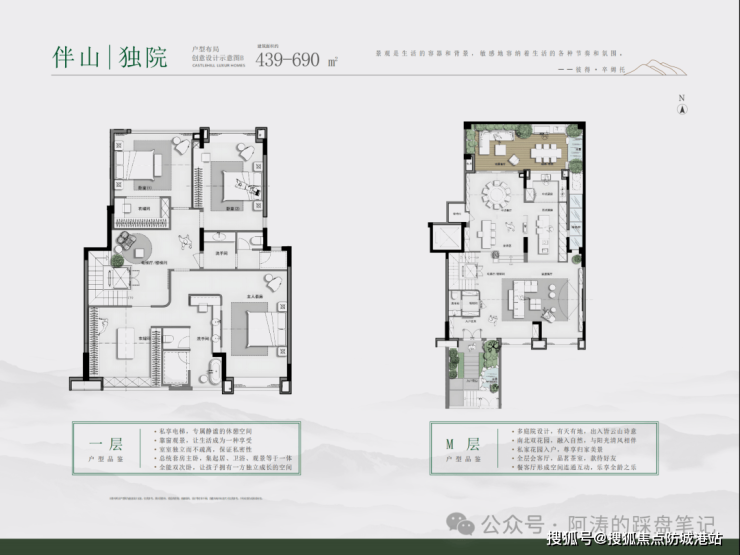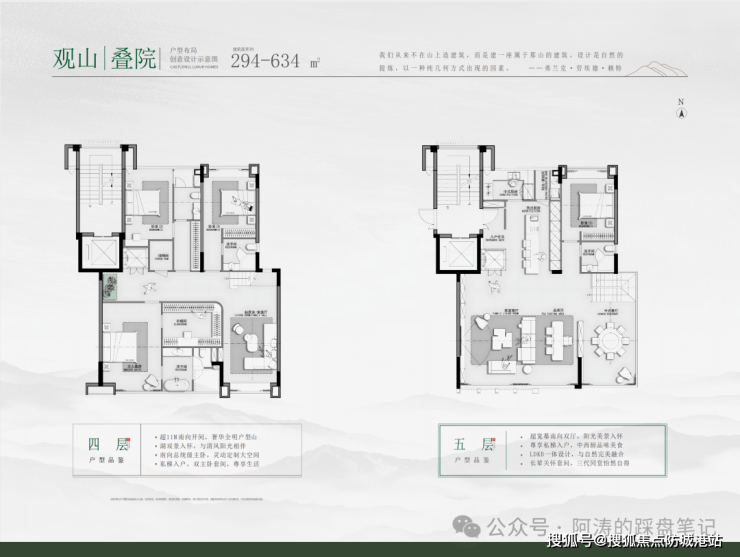 项目打造全维度多元化产品体系,覆盖不同高端客群的使用需求,所有户型均经过精细化空间设计,实现空间利用率与居住舒适度的最大化。项目在售主力户型涵盖 294㎡、311㎡、439㎡三大面积段,同时设置灵活可拆分的空间设计,部分平层产品可拆分为两套 150㎡的独立空间,兼顾了大尺度整体居住与多元化空间使用的双重需求。其中上叠产品建筑面积约 300㎡,涵盖 4-5 楼居住空间与天台专属使用区域,打造出有天有地的空中墅居体验;平层产品主力建筑面积约 310㎡,大面宽、短进深设计,实现全明采光与 270 度观景视野,大平层的通透格局适配高端家庭的自住需求;下叠产品建筑面积约 470-600㎡,涵盖 1 层、M 层与地下两层的多元空间,分层式设计实现居住、娱乐、接待、收藏等功能的完全分区,适配高端客群的全场景使用需求。