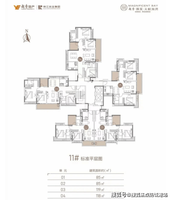 11栋作为重磅上新的山海河三景小高层,为17层、2梯5户设计,户型包括建面约85㎡、112㎡、118㎡、119㎡三至四空间。85㎡刚需三空间,布局紧凑实用,动静分区明确,客厅连接观景阳台,能欣赏到滨河景观,适合年轻夫妻或三口之家;112-119㎡改善型户型,空间开阔通透,主卧配备独立卫浴和衣帽间,次卧采光充足,部分户型可享山海河三重景观,视野极佳。