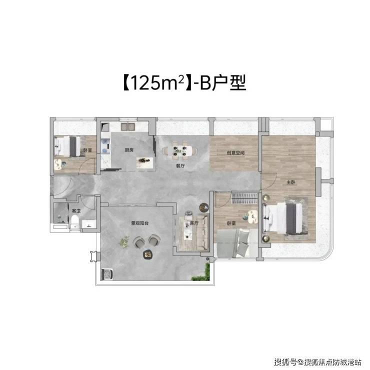 客厅宽敞明亮,连接着L型弧形飘窗的卫生间,采光通风俱佳,有效避免了潮湿问题。四个房间的布局科学合理,次卧空间充裕,可轻松摆放1.5米大床、双床头柜及通顶衣柜,满足儿童或老人的居住需求。该户型特别适合二胎家庭或与父母同住的家庭,在控制总价的同时,实现了房间数量的最大化,真正做到了“小而全、精而美”。