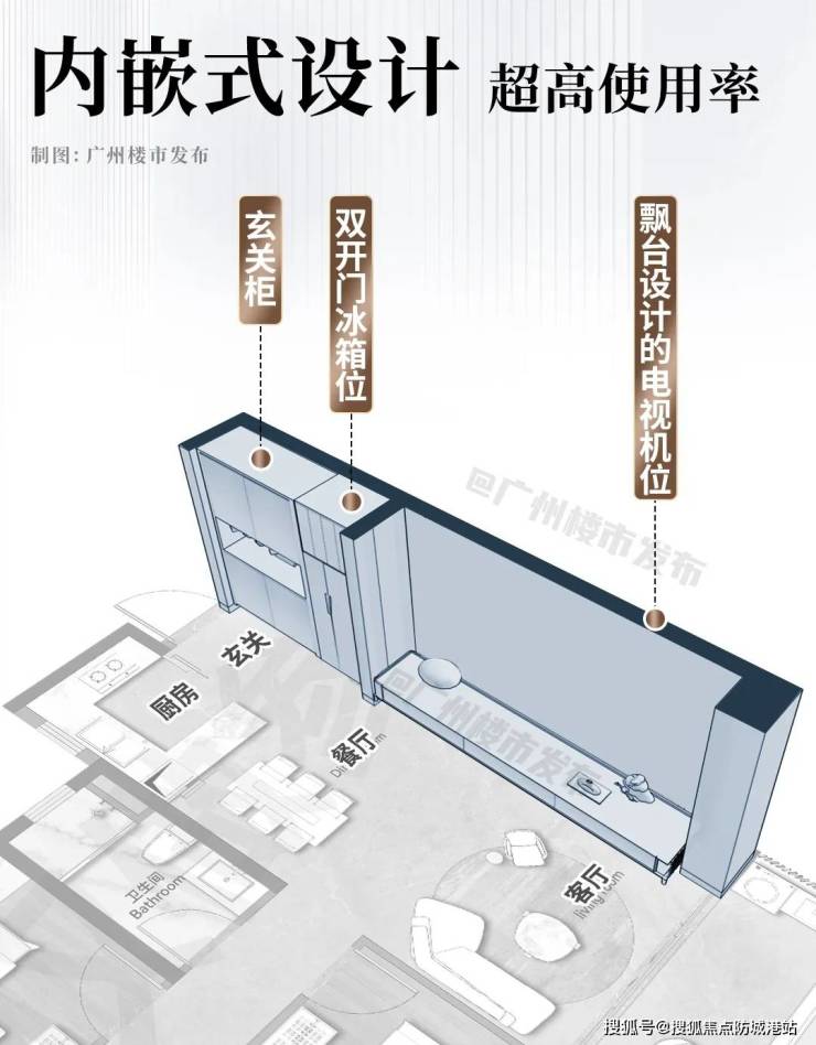 还有电视机位的飘台式设计,也很大程度提高了赠送率,延伸了客厅实际宽度。