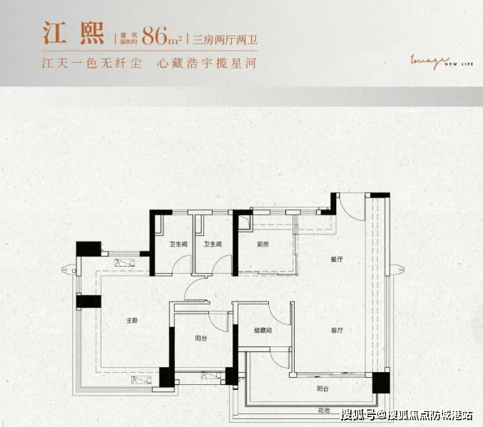 建面约86㎡:三房两厅两卫,南向观景大阳台,全屋动静分离,主卧带270°飘窗。