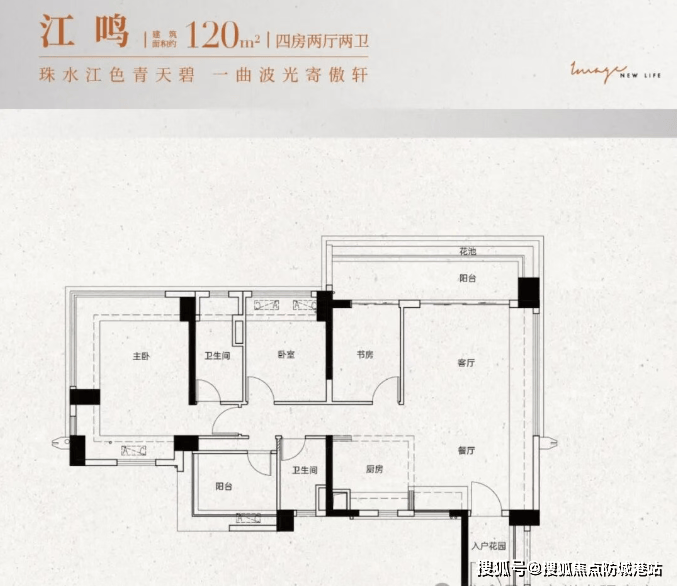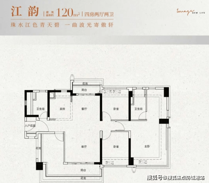 建面约120㎡:四房两厅两卫,四开间朝南,居住与生活动静分离,南向大阳台或南北双阳台,主卧带270°飘窗。