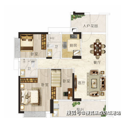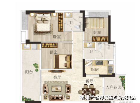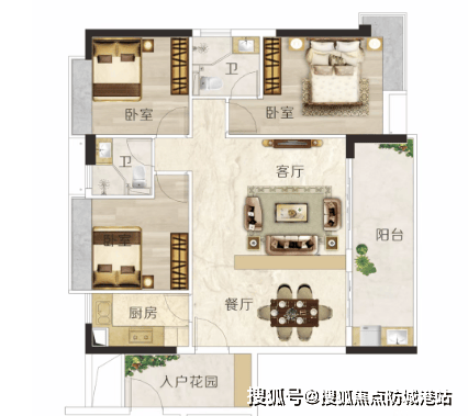 A户型:建面约101平方米,3房2厅2卫,配备入户花园和超广角巨幕阳台。