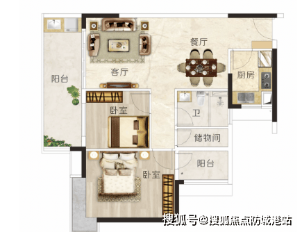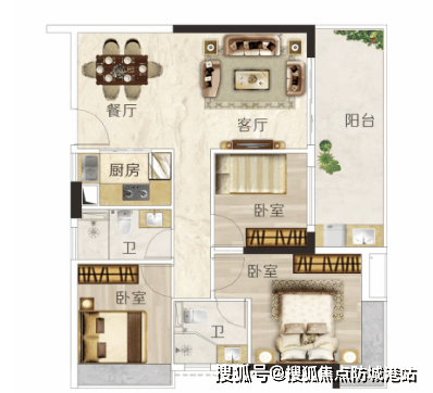 B户型:建面约85平方米,2房2厅1卫,设计方正实用,拥有三分离卫生间。