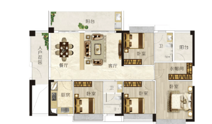D户型:建面约137平方米,4房2厅2卫,配有超大入户花园和主卧套房设计。