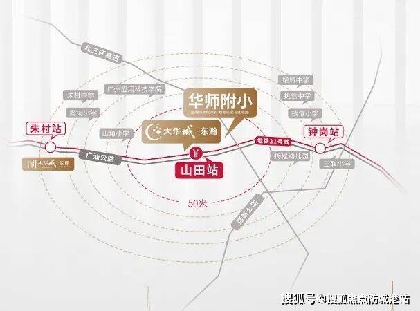 大华城——涵盖大华朱村中心城市地标(规划中)、地铁、教育、产业、商业、生态各项配套,名副其实的一生大城,未来容纳广州东约 30 万人口繁华居住地。