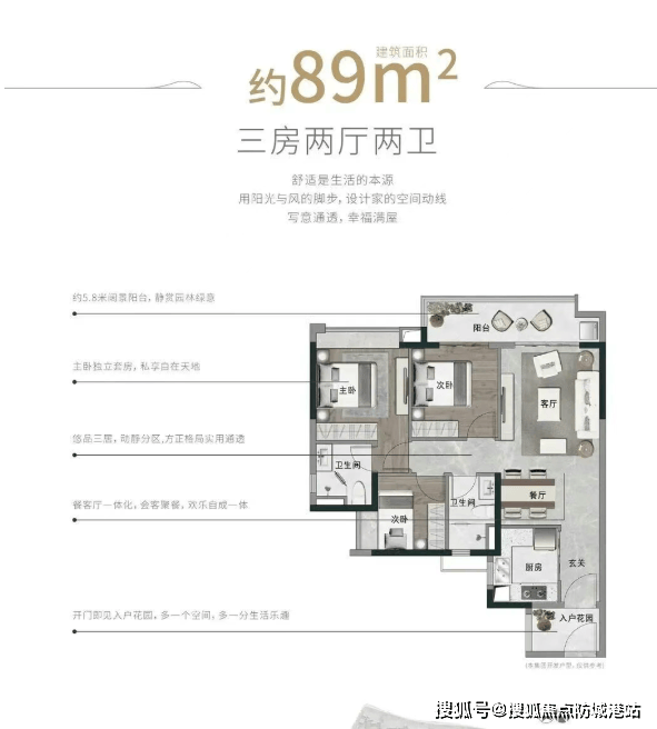 89㎡三房:配备约5.8米阔景阳台,采光通透,小户型亦享大视野;