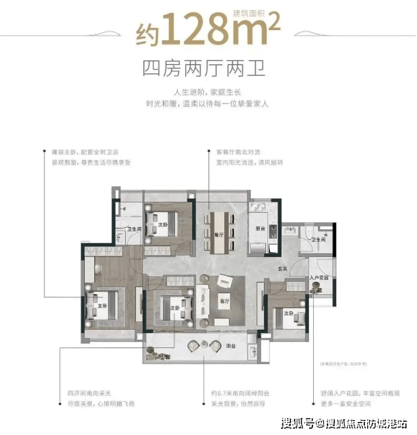 128㎡四房:南北对流,双卫设计,主卧套房配置,提升居住私密性;