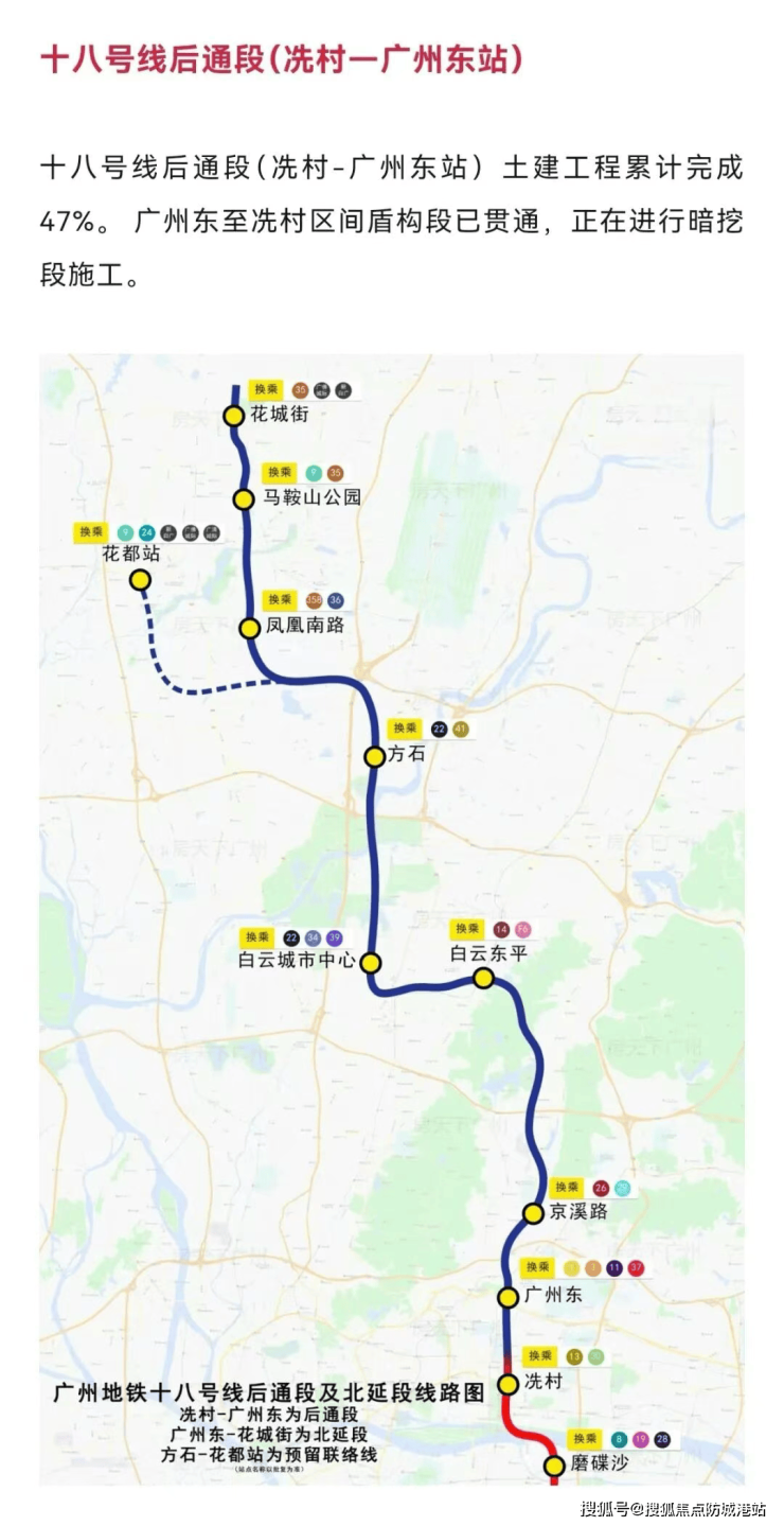 18号线北延段(在建):7站到冼村(珠江新城),设计时速160km/h,快线通勤;