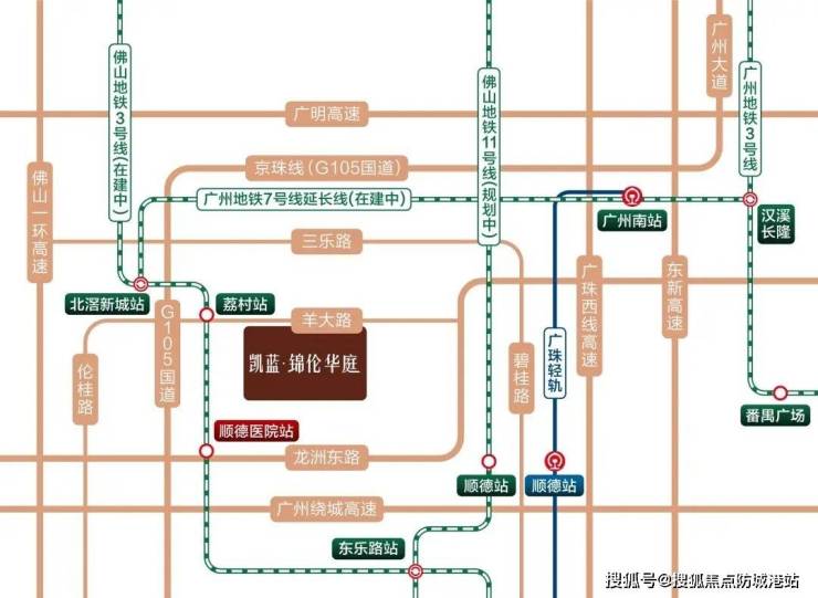 项目拥有令人艳羡的交通优势,打造出了 4D 立体交通路网。项目直距约 200 米处就是佛山地铁 3 号线顺德医院站,该线路与广州地铁 7 号线、佛山地铁 11 号线接驳,让业主轻松实现半小时广佛同城生活圈。无论是前往广州工作、学习,还是休闲娱乐,都能快速便捷地到达。从项目到轻轨顺德站仅需约 8 分钟车程,乘坐轻轨三站即可到达广州南,大大缩短了与外界的时空距离。此外,项目周边形成了二横六纵的道路交通网,通过这些主干道,可快速接驳佛山一环等快速路网,1 小时内畅捷大湾区。现时项目距白云机场直线距离约 50km,借助广佛环线,广佛 20 分钟内 “一线通达” 的目标得以实现,项目至白云机场的通行时间也大幅缩短。未来,居住在凯蓝・锦伦华庭,业主将轻松畅享便捷的出行体验,无论是日常通勤还是外出旅行,都能在短时间内快速抵达目的地,满足业主多样化的出行需求。