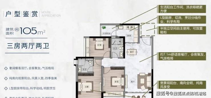 105㎡三房:纯南向阳台(长5.2米),采光时长日均8小时(实测春分日);L型厨房带阳台(通风好,油烟不易扩散);主卧套间(独立卫浴),隐私性强。