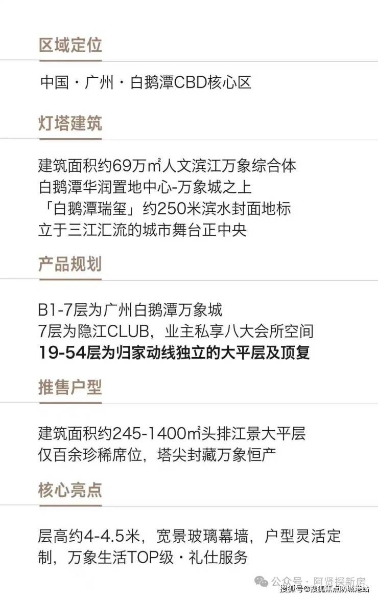 我们懂您对城市核心资源的占有需求,因此将项目落址白鹅潭CBD核心,让您坐拥千亿规划红利,下楼即享广州首座滨江万象城的世界级繁华,四地铁交汇的立体交通,让您随时通达全城,掌控生活的主动权。我们懂您对不可复制景观的极致追求,因此以约250米地标高度,为您收藏三江汇流的壮阔江景,270度环幕视野,将白云山、广州塔、白天鹅宾馆等城市地标尽数纳入窗前,让珠江的盛景,成为您日常生活的背景。我们懂您对塔尖生活的品质期许,因此以约4米奢阔层高、全玻璃幕墙设计、无承重墙的灵动空间,为您打造专属的滨江奢居,约3700㎡的隐江CLUB会所,华润万象生活的TOP级礼仕服务,让您的每一次归家,都是一场尊崇的礼遇。