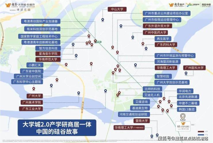 项目位于广州大学城板块核心区域,是南中国唯一兼具教育、科技、创新创业和高品质居住功能的综合性区域。周边集聚12所高校,20万师生生活与学习在此,形成独特高知人群社区。项目地段可谓“城市智识高地”,与国际创新城的产学研商居一体化模式相呼应,打造类似斯坦福+硅谷模式的科技与教育生态。
