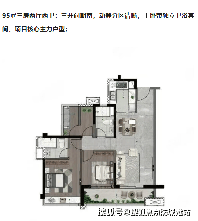具体来看,82至88平方米的三房两厅户型,堪称刚需入门的“黄金尺度”。设计师巧妙地将每一寸面积都利用到极致,竖厅设计让客厅显得宽敞明亮,南向大景观阳台更是点睛之笔,清晨的第一缕阳光洒满室内,傍晚的微风拂过阳台,带来无尽的惬意。这样的空间布局,既满足了小家庭的基本生活需求,又为未来的二胎计划预留了充足的空间,真正做到了一房多用,零浪费。而95平方米的三房两厅两卫户型,则是很多年轻家庭的理想之选。三开间朝南的布局,让主卧、次卧和客厅都能沐浴在阳光下,动静分区清晰,隐私性极佳。主卧配备独立卫浴,提升了生活的舒适度与便利性,无论是夫妻二人世界,还是三代同堂,都能找到属于自己的舒适角落。